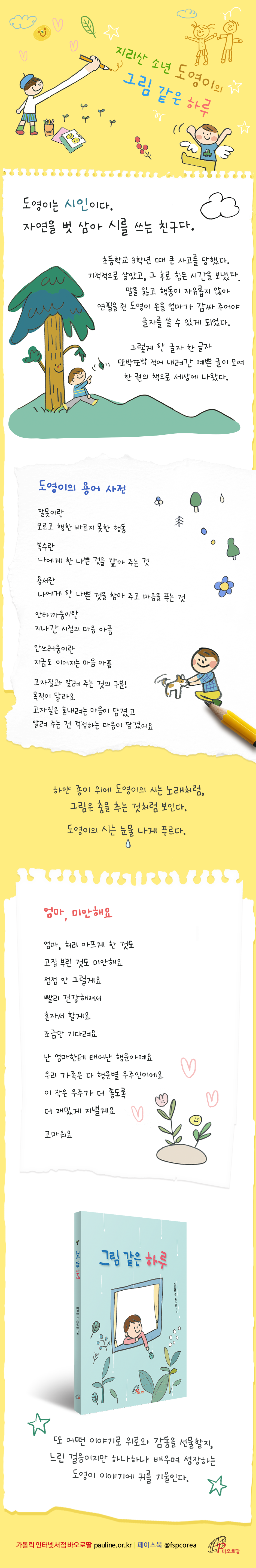 도영이는 초등학교 3학년 때 큰 사고를 당했다. 기적적으로 살았고, 그 후로 힘든 시간을 보냈다. 말을 잃고 행동이 자유롭지 않아 연필을 쥔 도영이 손을 엄마가 감싸 주어야 글자를 쓸 수 있게 되었다. 그렇게 한 글자 한 글자 또박또박 적어 내려간 예쁜 글이 모여 한 권의 책으로 세상에 나왔다.