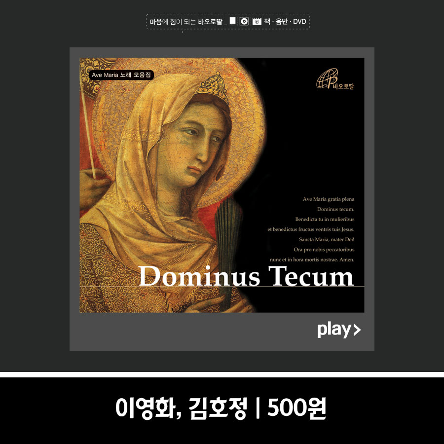 Dominus tecum 아티스트: 이영화 대표장르: 성탄/대림 발매일: 2005-05-24 앨범 상세정보 우리에게 알려진 성모님의 곡은 무척 다양하다. 특히 ‘아베마리아’는 슈베르트, 구노를 비롯하여 다양한 작��