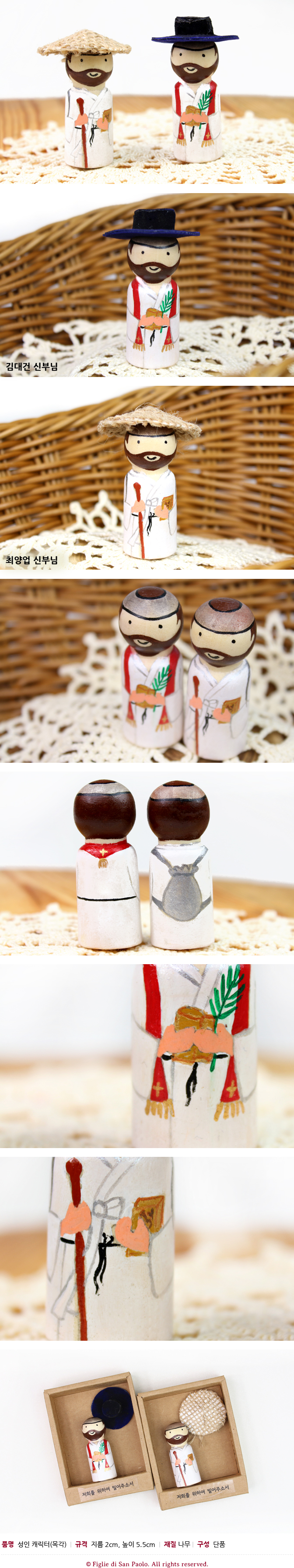 손 안에 쏙 들어오는 크기와 깜찍하게 표현된 성인 캐릭터가 어우러진 귀여운 느낌의 목각 인형으로 선반이나 탁자 등에 세워 놓거나 손에 잡고 기도하는 용도로 활용할 수 있습니다.